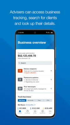 · View a summary of your total funds under administration, active accounts, net flows and fees from the business overview dashboard