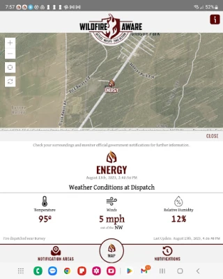 As a Premium feature of Wildfire Aware, we provide near real-time notifications of wildfires in areas you care about. When a fire is dispatched by a NIFC participating agency any where in the United States you are notified as quickly as possible. We provide wildfire alerts quickly and supplement that with the most current Fire Weather information as well, providing Temperature, Wind Speed and Direction and Relative Humidity at the time of the fire.