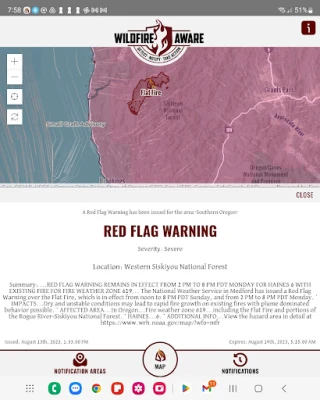 Anyone who has lived through a fire knows that Fire Weather is just as important as fire information. Wildfire Aware provides you National Weather Service (NWS) Alerts related to Wildfires as soon as they are issued. From Fire Weather Watches and Red Flag Warnings before a fire, to Flash Flood Warnings and Watches after a fire we keep you Wildfire Aware at all stages of a wildfire.